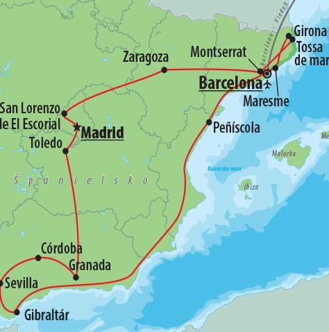 Rýchly popis: Počas zájazdu vás očarí palác El Escorial, kláštor Montserrat, katedrála v Seville, či Alcázar. Dojem zanechajú ulice Madridu, Granady, Barcelony a čerešničkou na torte bude návšteva Gibraltáru. Typ stravy: polpenzia Doprava: letecká V cene je zahrnuté: 9x ubytovanie v 3* hoteli s polpenziou, letecká doprava Bratislava - Barcelona - Bratislava alebo Budapešť - Barcelona - Budapešť (podľa výberu klienta), servisné poplatky, 1x podpalubná batožina 20 kg/os., transfer letisko - hotel - letisko, sprievodca CK, prehliadky podľa programu bez vstupov. V cene nie je zahrnuté: Povinné príplatky: orientačná cena pobytovej taxy 2 EUR/os./noc (platba na mieste). Odporúčaný doplatok: vstup do Alhambry 45 EUR/os. (objednaný vopred), komplexné cestovné poistenie KOMFORT alebo poistenie PLUS, orientačná cena vstupov 150 EUR/os. (platba na mieste). Ostatné doplatky: 1-lôžková izba 385 EUR/9 nocí. Batožinové limity: v prípade zmeny leteckej spoločnosti si CK vyhradzuje právo na ich zmenu. Program: 1. deň - prílet do Barcelony, transfer do hotela. 2. deň - raňajky, presun do metropoly Aragónska - Zaragozy. Prehliadka pamätihodností mesta - bazilika Santa María del Pilar, katedrála La Seo, arabský opevnený palác Aljafería, mudejarské kostoly a známa tržnica La Lanuza. Odchod a ubytovanie v okolí Madridu, večera. 3. deň - raňajky, prehliadka kráľovského paláca a kláštora El Escorial s bazilikou a panteónom v mestečku San Lorenzo de El Escorial (UNESCO). Presun do Madridu, prehliadka námestí: Plaza de Espaňa, Playa Mayor, Puerta del Sol a tiež Kráľovský palác. Individuálne voľno s možnosťou návštevy slávnej obrazárne El Prado. Návrat do hotela, večera. 4. deň - raňajky, presun do mesta Toledo (UNESCO), kde je dominantnou pamiatkou pevnosť Alcázar. Nasleduje prehliadka slávnej toledskej katedrály, námestia Zocodóver a múzea maliara El Greca. Pokračovanie do Granady, ubytovanie, večera. 5. deň - raňajky, prehliadka slávnej Granady. Uličky štvrte Albacín vedú ku kostolu San Nicolas, odkiaľ je vidieť celý komplex Alhambry s pevnosťou Alcazába. Návšteva Levieho dvora a záhrad Generalife. Návrat do hotela, večera. Fakultatívne - možnosť návštevy predstavenia flamenca. 6. deň - raňajky, pokračovanie do Córdoby, prehliadka perly maurskej architektúry, córdobskej mešity - La Mezquita. Prechádzka po židovskej štvrti a návšteva córdobskej synagógy. Presun do hlavného mesta Andalúzie - Sevilly, ubytovanie, večera. 7. deň - raňajky. Začiatok prehliadky mesta v kráľovskom paláci Alcázar. Pokračovanie labyrintom židovskej štvrte a návšteva sevillskej katedrály. Transfer a následná prehliadka britskej kolónie Gibraltár. Nočný prejazd na pobrežie Costa Azahar. 8. deň - príchod v ranných hodinách. Dopoludnia individuálne voľno v malebnom mestečku Peñíscola, ktorého dominantou je hrad postavený templármi v 13. storočí. Nachádza sa tam tiež krásna dlhá piesočnatá pláž a rybársky prístav. Popoludní transfer - Costa Brava/Maresme, ubytovanie, večera. 9. deň - raňajky, prehliadka mesta Girona a jej najvýznamnejších pamiatok, židovská štvrť El Call, arabské kúpele z 15. storočia a katedrála Santa Maria de Girona. Presun do mestečka Tossa de Mar. Krátka prechádzka na vyhliadku k majáku, odkiaľ sa naskytnú úchvatné pohľady na pobrežie Stredozemného mora. Ubytovanie, večera. 10. deň - raňajky, prehliadka kláštora Montserrat. Areál kláštora tvorí bazilika, malé múzeum so zbierkou archeologických nálezov zo Stredného východu a múzeum s obrazmi slávnych svetových maliarov. Popoludní presun do Bacelony. Okružná jazda mestom - Sagrada Família, Arc de Triomf - bývalá aréna býčích zápasov a námestie Placa Catalunya, Passeig de Gracia - Gaudího domy, námestie Placa d´Espanya, Olympijský štadión na vrchu Montjuic. Krátke individuálne voľno. Ubytovanie, večera. 11. deň - raňajky, transfer na letisko a odlet do Viedne. Dni: 11 DŇOVÝ POZNÁVACÍ ZÁJAZD Pamiatky v programe pre leták: Zaragoza - Madrid - Toledo - Granada - Córdoba - Sevilla - Gibraltár - Peñíscola - Girona - Tossa de Mar - Montserrat - Bacelona |